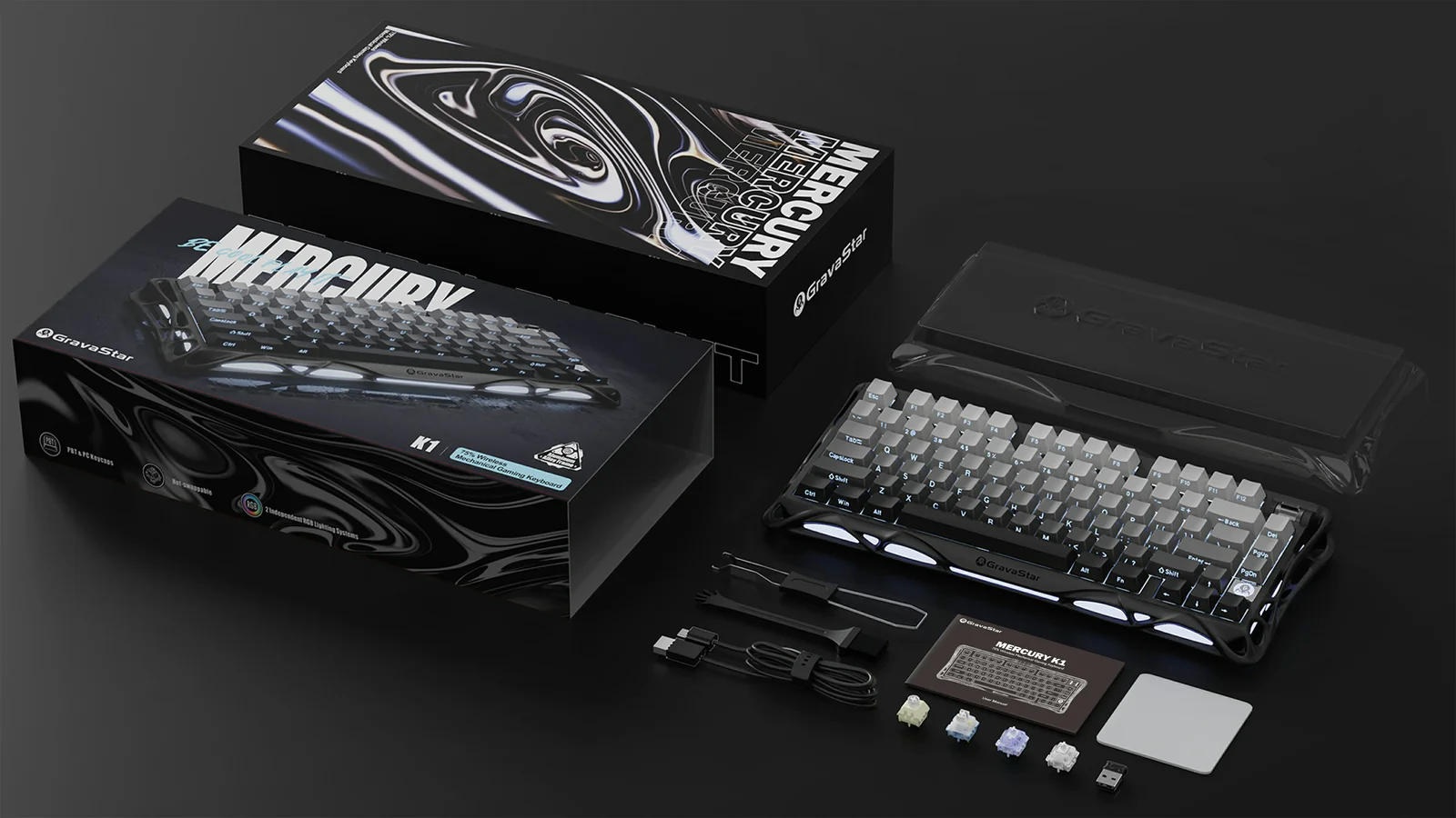 GravaStar Mercury K1 — механическая клавиатура с корпусом из глянцевого алюминиевого сплава. Поддерживает три режима подключения: проводное, Bluetooth и беспроводное 2.4 ГГц. Емкий аккумулятор на 8000 мАч обеспечивает долгую работу.
